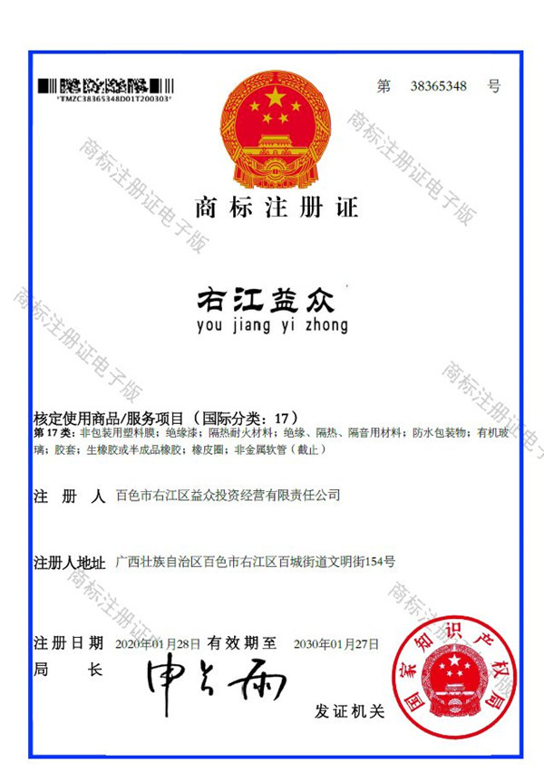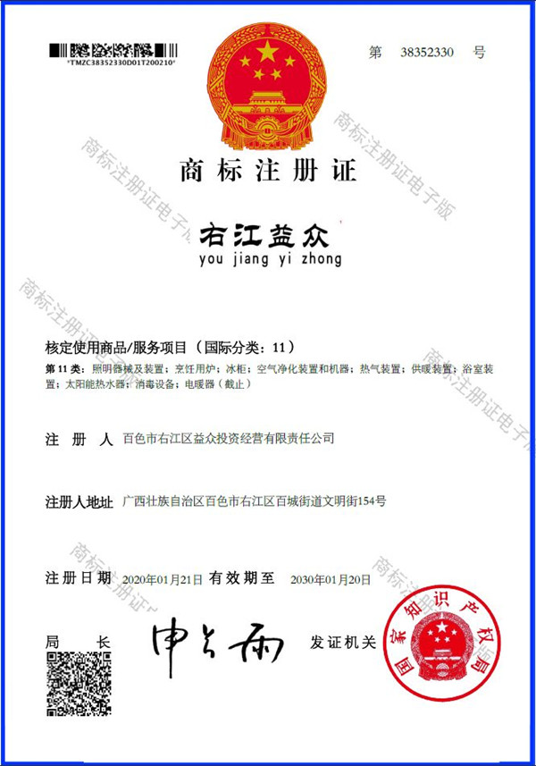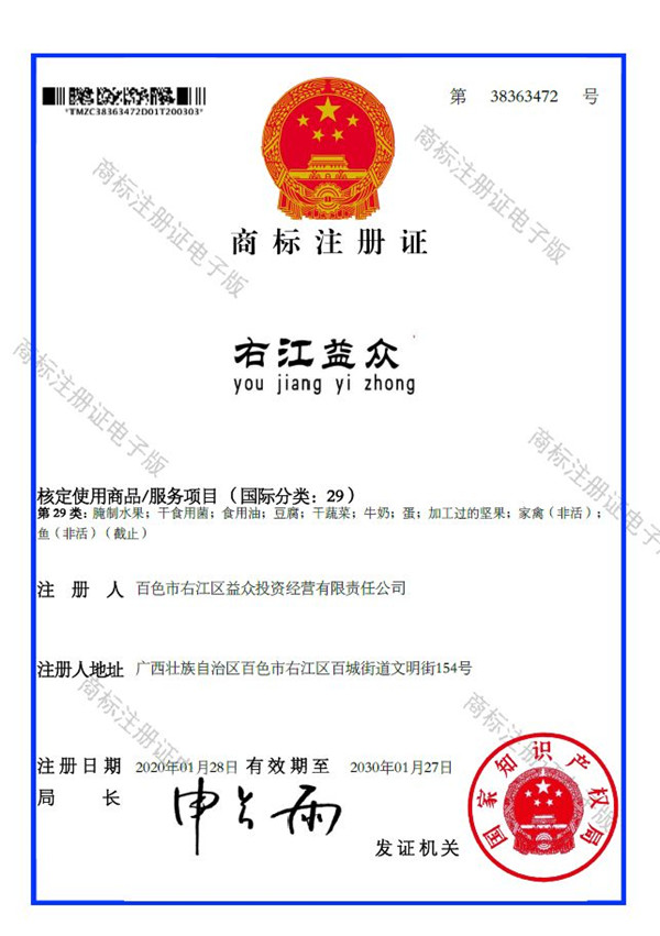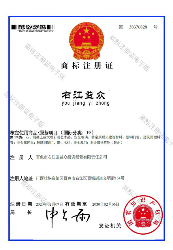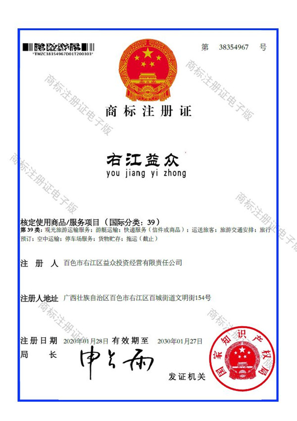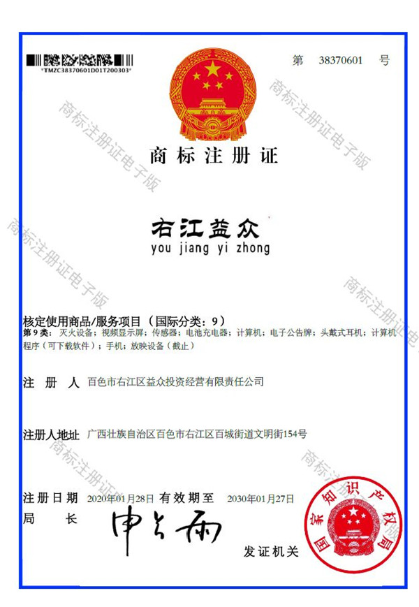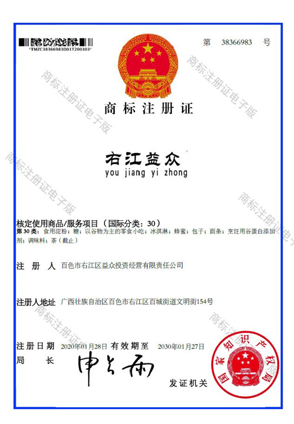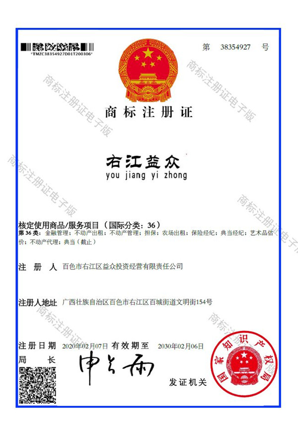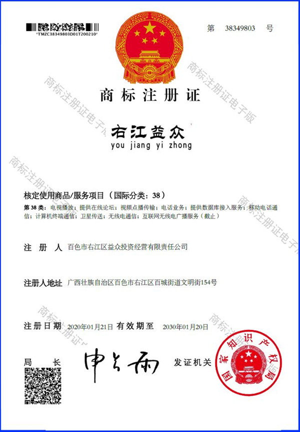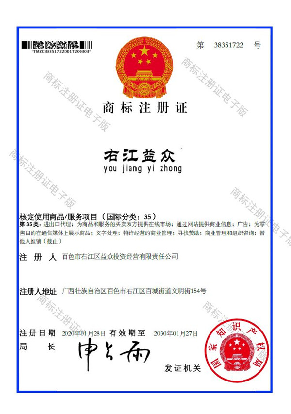 2019年4月,為樹立企業(yè)品牌形象,充分展現(xiàn)品牌價值,廣西百色益眾投資有限公司按照建設(shè)現(xiàn)代企業(yè)的方向和標(biāo)準(zhǔn),啟動品牌商標(biāo)注冊申報工作,經(jīng)過6個月的審核期和3個月的公告期,“右江益眾”45個大類商標(biāo)品牌第一時間成功獲批?!坝医姹姟逼放频某晒ψ?,有利于公司更好地參與市場競爭,同時,對于強化企業(yè)內(nèi)部管理、樹立良好的企業(yè)形象、提升公司美譽度也可起到積極的助推作用。