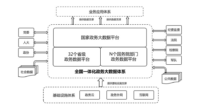 全國(guó)一體化政務(wù)大數(shù)據(jù)體系包括三類平臺(tái)和三大支撐。三類平臺(tái)為“1+32+N”框架結(jié)構(gòu)?!?”是指國(guó)家政務(wù)大數(shù)據(jù)平臺(tái),是我國(guó)政務(wù)數(shù)據(jù)管理的總樞紐、政務(wù)數(shù)據(jù)流轉(zhuǎn)的總通道、政務(wù)數(shù)據(jù)服務(wù)的總門(mén)戶;“32”是指31個(gè)省(自治區(qū)、直轄市)和新疆生產(chǎn)建設(shè)兵團(tuán)統(tǒng)籌建設(shè)的省級(jí)政務(wù)數(shù)據(jù)平臺(tái),負(fù)責(zé)本地區(qū)政務(wù)數(shù)據(jù)的目錄編制、供需對(duì)接、匯聚整合、共享開(kāi)放,與國(guó)家平臺(tái)實(shí)現(xiàn)級(jí)聯(lián)對(duì)接;“N”是指國(guó)務(wù)院有關(guān)部門(mén)的政務(wù)數(shù)據(jù)平臺(tái),負(fù)責(zé)本部門(mén)本行業(yè)數(shù)據(jù)匯聚整合與供需對(duì)接,與國(guó)家平臺(tái)實(shí)現(xiàn)互聯(lián)互通,尚未建設(shè)政務(wù)數(shù)據(jù)平臺(tái)的部門(mén),可由國(guó)家平臺(tái)提供服務(wù)支撐。三大支撐包括管理機(jī)制、標(biāo)準(zhǔn)規(guī)范、安全保障三個(gè)方面。