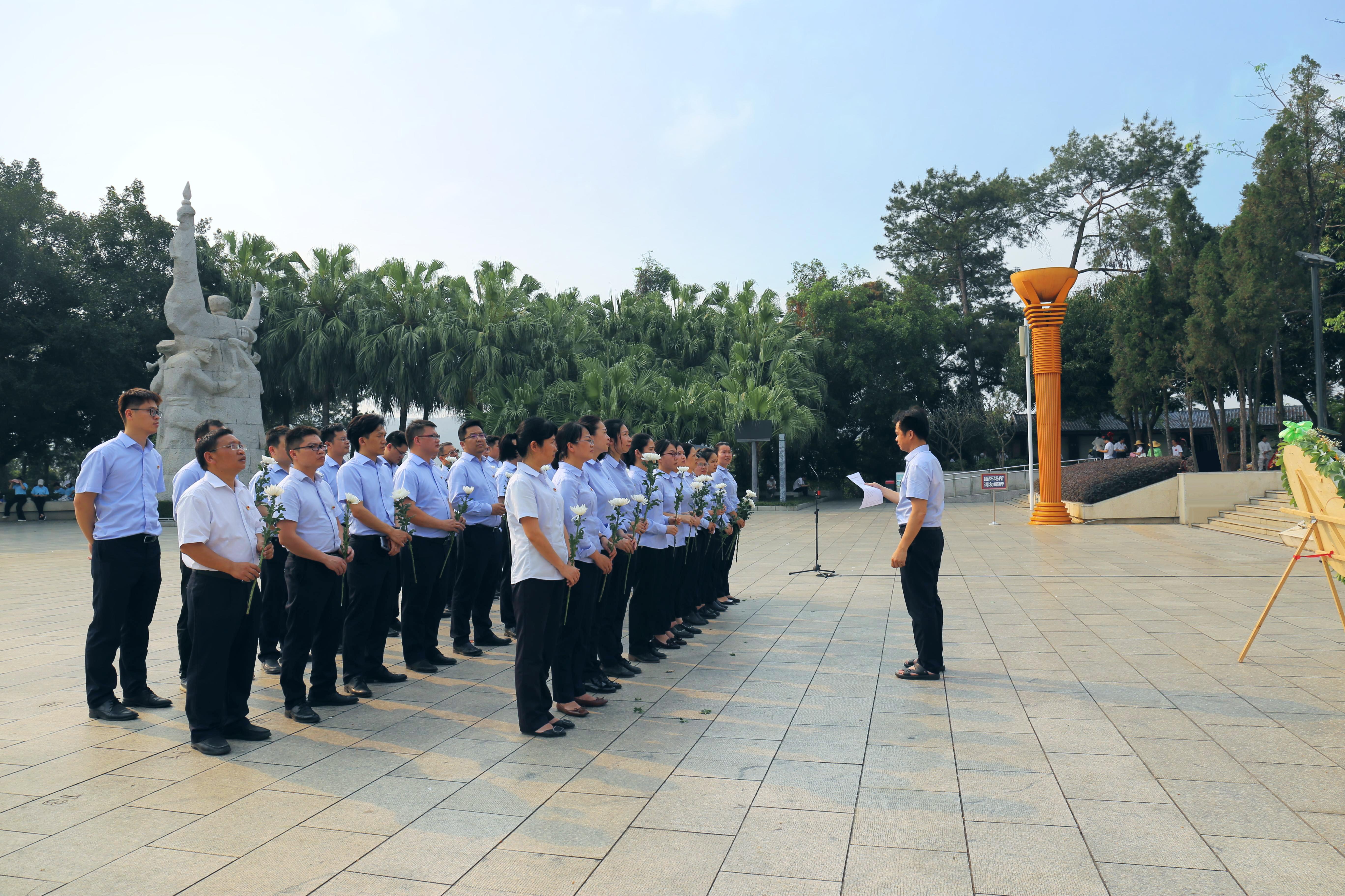 ????????全體黨員肅立默哀,向革命先烈敬獻(xiàn)花圈,莊重鞠躬表達(dá)對烈士的深切哀悼和無盡的敬仰之情。在黨支部書記岑文同志的帶領(lǐng)下,大家懷著對先烈無比崇敬的心情,列隊拾階繞碑體一周,并依次上臺為烈士們獻(xiàn)花,表達(dá)對革命烈士崇高的敬意和深切的哀思。