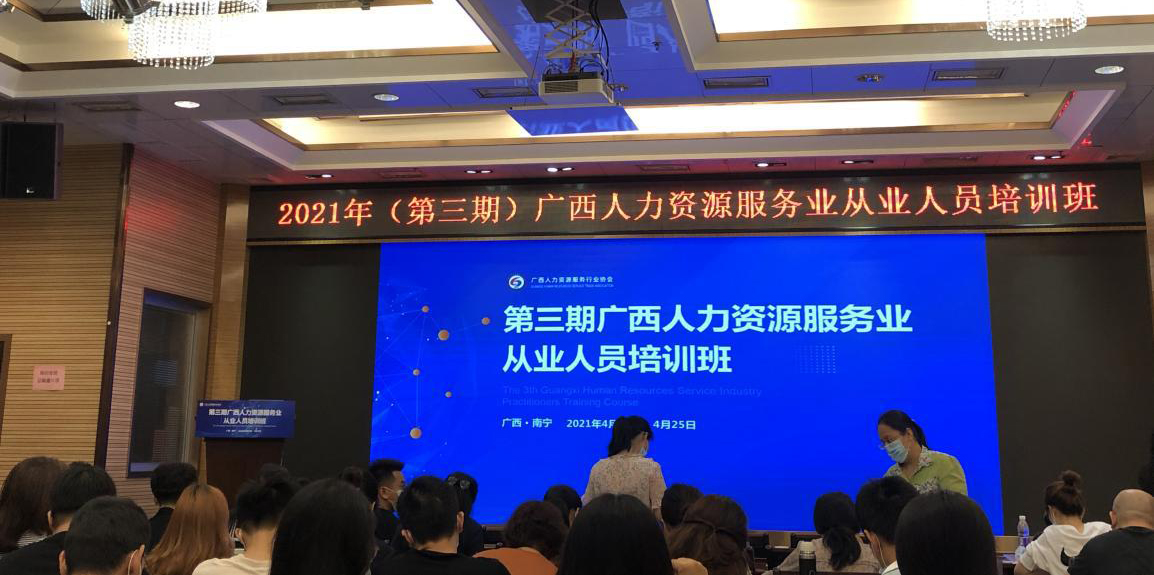 ????????2021年(第三期)廣西人力資源服務(wù)業(yè)從業(yè)人員培訓(xùn)班近日在南寧舉辦,各市企事業(yè)單位從事人力資源工作人員,以及全區(qū)各類人力資源服務(wù)機(jī)構(gòu)從業(yè)人員參加培訓(xùn),益嘉人資公司派一人參加。