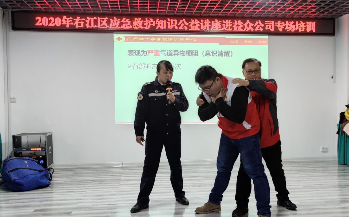 ????????培訓由廣西紅十字會救護訓練中心教務(wù)科長辛健敏老師主講。在培訓中,辛老師介紹了應(yīng)急救護基本知識及心肺復蘇等技能實踐操作,參訓員工們在培訓人員的指導下認真動手演練,通過理論和實操相結(jié)合方式,掌握基本應(yīng)急救護知識技能,并就日常生活中遇到的應(yīng)急救護步驟進行解答。