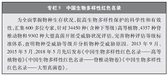 開(kāi)展全國(guó)生物多樣性調(diào)查與評(píng)估。大力推進(jìn)生物多樣性保護(hù)重大工程實(shí)施,結(jié)合自然資源調(diào)查、生態(tài)系統(tǒng)監(jiān)測(cè)評(píng)估等工作,不斷完善生物多樣性調(diào)查與評(píng)估能力,首次將生物多樣性指標(biāo)納入生態(tài)質(zhì)量綜合評(píng)價(jià)指標(biāo)體系,引導(dǎo)地方加強(qiáng)生態(tài)文明建設(shè)與生物多樣性保護(hù)。開(kāi)展自然資源調(diào)查,包括森林、草原、水、濕地、荒漠、海洋等,建立自然資源調(diào)查評(píng)價(jià)監(jiān)測(cè)制度。構(gòu)建了涵蓋2376個(gè)縣級(jí)行政單元、樣線總長(zhǎng)超過(guò)3.4萬(wàn)公里的物種分布數(shù)據(jù)庫(kù),建立物種資源調(diào)查及收集信息平臺(tái),準(zhǔn)確反映野生動(dòng)植物空間分布狀況。完成長(zhǎng)江經(jīng)濟(jì)帶、京津冀等國(guó)家戰(zhàn)略區(qū)域180多個(gè)縣級(jí)行政區(qū)生物多樣性調(diào)查與評(píng)估。組織開(kāi)展近海漁業(yè)資源調(diào)查,初步掌握近海漁業(yè)資源狀況。陸續(xù)發(fā)布《中國(guó)植物紅皮書(shū)》《中國(guó)瀕危動(dòng)物紅皮書(shū)》《中國(guó)物種紅色名錄》《中國(guó)生物多樣性紅色名錄》,基本掌握生物多樣性總體情況,為加強(qiáng)生物多樣性保護(hù)奠定了科學(xué)基礎(chǔ)。