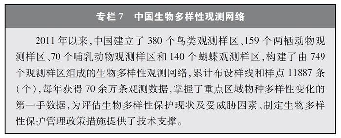 完善監(jiān)測(cè)觀測(cè)網(wǎng)絡(luò)。中國(guó)建立起各類(lèi)生態(tài)系統(tǒng)、物種的監(jiān)測(cè)觀測(cè)網(wǎng)絡(luò),在生物多樣性理論研究、技術(shù)示范與推廣以及物種與生境保護(hù)方面發(fā)揮了重要作用,為科研、教育、科普、生產(chǎn)等各領(lǐng)域提供了多樣化的信息服務(wù)與決策支持。其中,中國(guó)生態(tài)系統(tǒng)研究網(wǎng)絡(luò)(CERN)、國(guó)家陸地生態(tài)系統(tǒng)定位觀測(cè)研究網(wǎng)絡(luò)(CTERN)涵蓋所有生態(tài)系統(tǒng)和要素,中國(guó)生物多樣性監(jiān)測(cè)與研究網(wǎng)絡(luò)(Sino BON)覆蓋動(dòng)物、植物、微生物等多種生物類(lèi)群,中國(guó)生物多樣性觀測(cè)網(wǎng)絡(luò)(China BON)構(gòu)建了覆蓋全國(guó)的指示物種類(lèi)群觀測(cè)樣區(qū)。