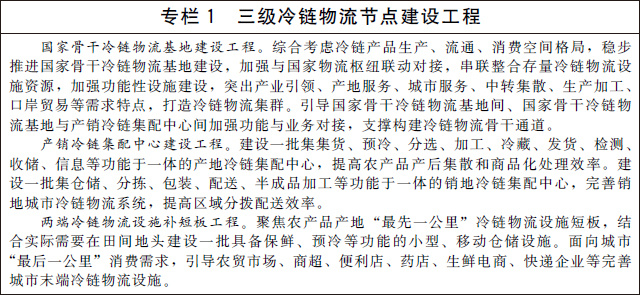——基礎(chǔ)設(shè)施更加完善。依托農(nóng)產(chǎn)品優(yōu)勢產(chǎn)區(qū)、重要集散地和主銷區(qū),布局建設(shè)100個左右國家骨干冷鏈物流基地;圍繞服務(wù)農(nóng)產(chǎn)品產(chǎn)地集散、優(yōu)化冷鏈產(chǎn)品銷地網(wǎng)絡(luò),建設(shè)一批產(chǎn)銷冷鏈集配中心;聚焦產(chǎn)地“最先一公里”和城市“最后一公里”,補齊兩端冷鏈物流設(shè)施短板,基本建成以國家骨干冷鏈物流基地為核心、產(chǎn)銷冷鏈集配中心和兩端冷鏈物流設(shè)施為支撐的三級冷鏈物流節(jié)點設(shè)施網(wǎng)絡(luò),支撐冷鏈物流深度融入“通道+樞紐+網(wǎng)絡(luò)”現(xiàn)代物流運行體系,與國家物流網(wǎng)絡(luò)實現(xiàn)協(xié)同建設(shè)、融合發(fā)展。