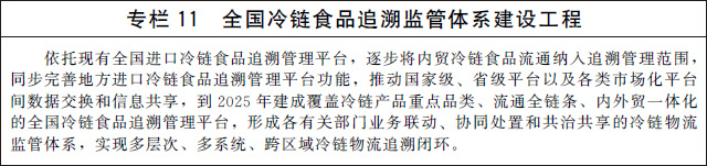 加快建設(shè)全國性冷鏈物流追溯監(jiān)管平臺,完善全鏈條監(jiān)管機(jī)制,針對冷鏈物流環(huán)境、主要作業(yè)環(huán)節(jié)、設(shè)施設(shè)備管理等重點,規(guī)范實時監(jiān)測、及時處置、評估反饋等監(jiān)管過程,逐步分類實現(xiàn)全程可視可控、可溯源、可追查。創(chuàng)新監(jiān)管手段,加大現(xiàn)代信息技術(shù)和設(shè)施設(shè)備應(yīng)用力度,強(qiáng)化現(xiàn)場和非現(xiàn)場監(jiān)管方式有機(jī)結(jié)合。借鑒新冠肺炎疫情防控期間進(jìn)口冷鏈?zhǔn)称窓z驗檢測檢疫經(jīng)驗做法,優(yōu)化完善工作機(jī)制,建立科學(xué)、可靠、高效的冷鏈物流檢驗檢測檢疫體系。