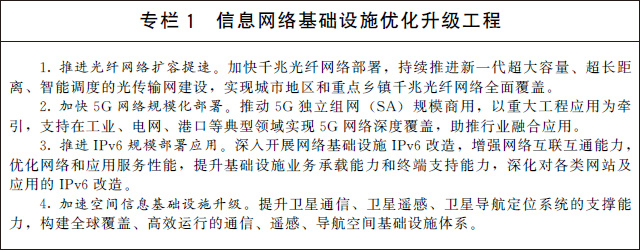 (一)加快建設(shè)信息網(wǎng)絡(luò)基礎(chǔ)設(shè)施。建設(shè)高速泛在、天地一體、云網(wǎng)融合、智能敏捷、綠色低碳、安全可控的智能化綜合性數(shù)字信息基礎(chǔ)設(shè)施。有序推進(jìn)骨干網(wǎng)擴(kuò)容,協(xié)同推進(jìn)千兆光纖網(wǎng)絡(luò)和5G網(wǎng)絡(luò)基礎(chǔ)設(shè)施建設(shè),推動(dòng)5G商用部署和規(guī)模應(yīng)用,前瞻布局第六代移動(dòng)通信(6G)網(wǎng)絡(luò)技術(shù)儲(chǔ)備,加大6G技術(shù)研發(fā)支持力度,積極參與推動(dòng)6G國際標(biāo)準(zhǔn)化工作。積極穩(wěn)妥推進(jìn)空間信息基礎(chǔ)設(shè)施演進(jìn)升級(jí),加快布局衛(wèi)星通信網(wǎng)絡(luò)等,推動(dòng)衛(wèi)星互聯(lián)網(wǎng)建設(shè)。提高物聯(lián)網(wǎng)在工業(yè)制造、農(nóng)業(yè)生產(chǎn)、公共服務(wù)、應(yīng)急管理等領(lǐng)域的覆蓋水平,增強(qiáng)固移融合、寬窄結(jié)合的物聯(lián)接入能力。