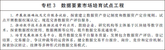 (二)加快數(shù)據(jù)要素市場(chǎng)化流通。加快構(gòu)建數(shù)據(jù)要素市場(chǎng)規(guī)則,培育市場(chǎng)主體、完善治理體系,促進(jìn)數(shù)據(jù)要素市場(chǎng)流通。鼓勵(lì)市場(chǎng)主體探索數(shù)據(jù)資產(chǎn)定價(jià)機(jī)制,推動(dòng)形成數(shù)據(jù)資產(chǎn)目錄,逐步完善數(shù)據(jù)定價(jià)體系。規(guī)范數(shù)據(jù)交易管理,培育規(guī)范的數(shù)據(jù)交易平臺(tái)和市場(chǎng)主體,建立健全數(shù)據(jù)資產(chǎn)評(píng)估、登記結(jié)算、交易撮合、爭(zhēng)議仲裁等市場(chǎng)運(yùn)營體系,提升數(shù)據(jù)交易效率。嚴(yán)厲打擊數(shù)據(jù)黑市交易,營造安全有序的市場(chǎng)環(huán)境。