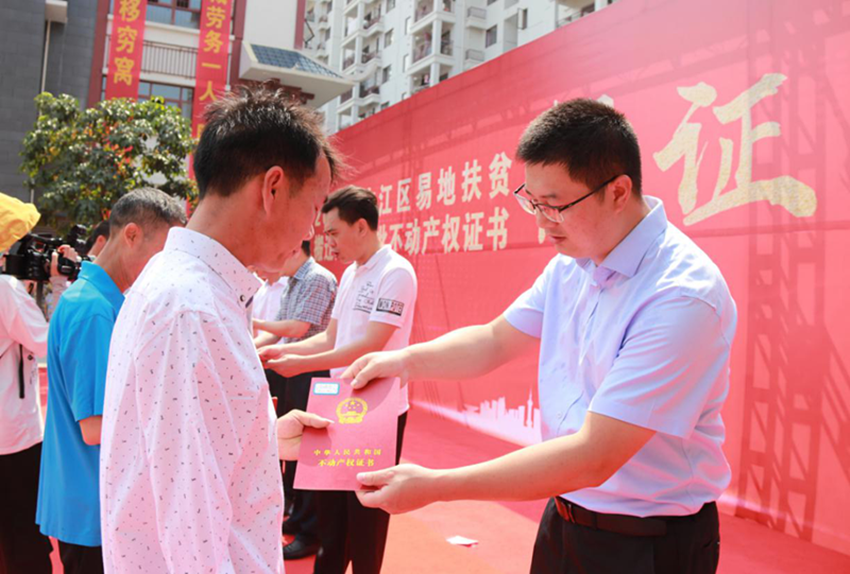 “老鄉(xiāng)家園—迎龍易地扶貧搬遷安置小鎮(zhèn)”是由益眾投資公司作為業(yè)主負責實施建設,2017年3月開工,同年11月建成安置住房11棟1304套。日前,公司順利辦理了第一批26戶搬遷戶不動產(chǎn)權證書,全面啟動安置小鎮(zhèn)不動產(chǎn)權證書發(fā)放工作。