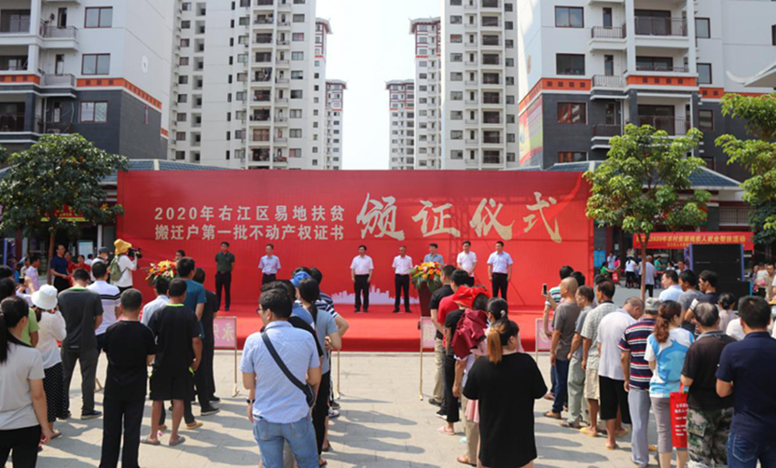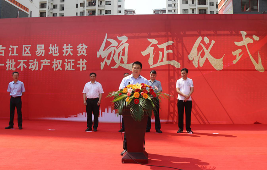 5月16日上午,右江區(qū)“老鄉(xiāng)家園—迎龍易地扶貧搬遷安置小鎮(zhèn)”搬遷戶不動產(chǎn)權證書頒證儀式在安置小鎮(zhèn)舉行,第一批26戶搬遷戶順利拿到了產(chǎn)權證書。百色市發(fā)改委副主任、市水庫和扶貧易地安置管理局局長羅加攀,右江區(qū)委常委、區(qū)人民政府副區(qū)長岑萬興,右江區(qū)委常委、宣傳部部長、區(qū)人民政府副區(qū)長王世凡,右江區(qū)委常委、辦公室主任盧靈及右江區(qū)直單位、鄉(xiāng)鎮(zhèn)代表,廣西百色益眾投資有限公司董事長、總經(jīng)理趙家臣出席儀式。儀式由王世凡主持。