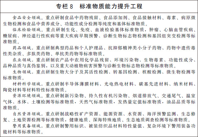 (二十)加大標(biāo)準(zhǔn)物質(zhì)研制應(yīng)用。建立完善以國家基準(zhǔn)物質(zhì)、國家標(biāo)準(zhǔn)物質(zhì)和工作標(biāo)準(zhǔn)物質(zhì)為主要組成部分的標(biāo)準(zhǔn)物質(zhì)體系。實施標(biāo)準(zhǔn)物質(zhì)能力提升工程,加快生命科學(xué)、生物醫(yī)藥、環(huán)境監(jiān)測、食品安全、自然資源、刑事司法等重點領(lǐng)域的標(biāo)準(zhǔn)物質(zhì)研制和應(yīng)用。加強(qiáng)標(biāo)準(zhǔn)物質(zhì)監(jiān)管能力建設(shè)和關(guān)鍵共性技術(shù)研究,提升標(biāo)準(zhǔn)物質(zhì)不確定度水平。探索建立標(biāo)準(zhǔn)物質(zhì)質(zhì)量追溯制度,建設(shè)一批標(biāo)準(zhǔn)物質(zhì)量值核查驗證實驗室,建立標(biāo)準(zhǔn)物質(zhì)質(zhì)量追溯平臺,形成研發(fā)、生產(chǎn)、應(yīng)用全壽命周期的監(jiān)管能力。