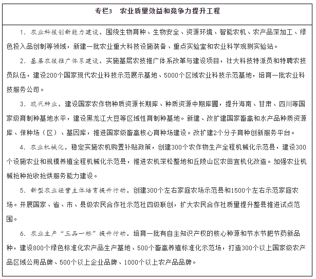 推進(jìn)重點(diǎn)區(qū)域農(nóng)業(yè)發(fā)展。深入推進(jìn)京津冀現(xiàn)代農(nóng)業(yè)協(xié)同發(fā)展,支持雄安新區(qū)建設(shè)綠色生態(tài)農(nóng)業(yè)。深化粵港澳大灣區(qū)農(nóng)業(yè)合作,建設(shè)與國際一流灣區(qū)和世界級城市群相配套的綠色農(nóng)產(chǎn)品生產(chǎn)供應(yīng)基地。推進(jìn)長江三角洲區(qū)域農(nóng)業(yè)一體化發(fā)展,先行開展農(nóng)產(chǎn)品冷鏈物流、環(huán)境聯(lián)防聯(lián)治等統(tǒng)一標(biāo)準(zhǔn)試點(diǎn),發(fā)展特色鄉(xiāng)村經(jīng)濟(jì)。發(fā)揮海南自由貿(mào)易港優(yōu)勢,擴(kuò)大農(nóng)業(yè)對外開放,建設(shè)全球熱帶農(nóng)業(yè)中心和動植物種質(zhì)資源引進(jìn)中轉(zhuǎn)基地。全域推進(jìn)成渝地區(qū)雙城經(jīng)濟(jì)圈城鄉(xiāng)統(tǒng)籌發(fā)展,建設(shè)現(xiàn)代高效特色農(nóng)業(yè)帶。