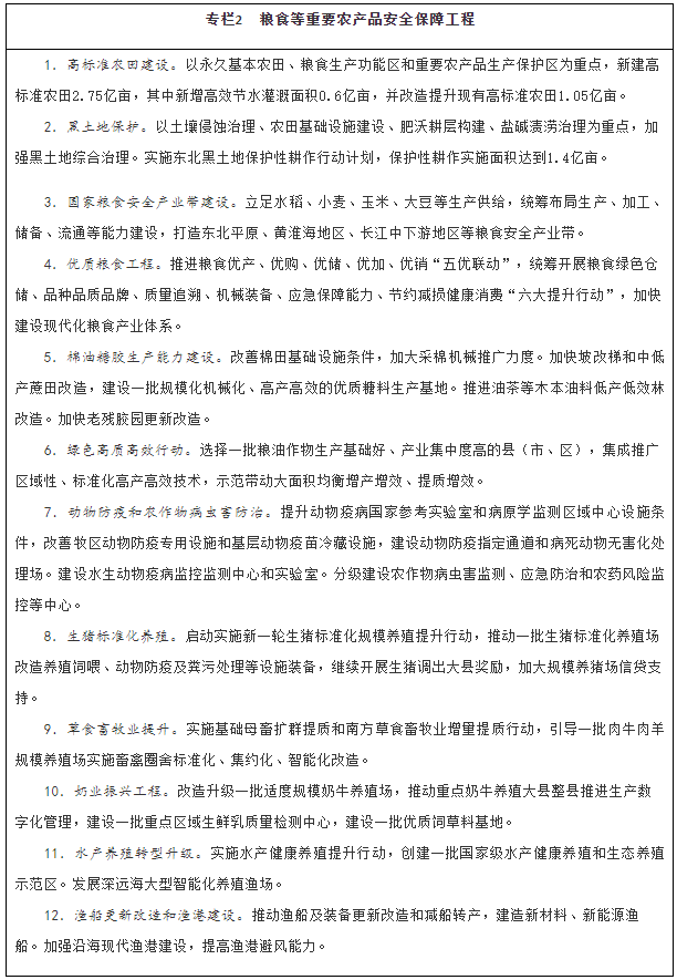 ——糧食等重要農(nóng)產(chǎn)品供給有效保障。糧食綜合生產(chǎn)能力穩(wěn)步提升,產(chǎn)量保持在1.3萬億斤以上,確保谷物基本自給、口糧絕對安全。生豬產(chǎn)能鞏固提升,棉花、油料、糖料和水產(chǎn)品穩(wěn)定發(fā)展,其他重要農(nóng)產(chǎn)品保持合理自給水平。