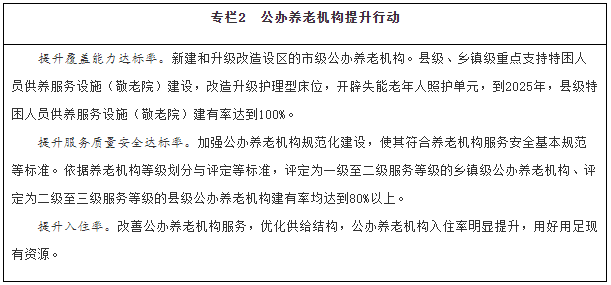 養(yǎng)老服務(wù)供給不斷擴大。覆蓋城鄉(xiāng)、惠及全民、均衡合理、優(yōu)質(zhì)高效的養(yǎng)老服務(wù)供給進一步擴大,家庭養(yǎng)老照護能力有效增強,兜底養(yǎng)老服務(wù)更加健全,普惠養(yǎng)老服務(wù)資源持續(xù)擴大,多層次多樣化養(yǎng)老服務(wù)優(yōu)質(zhì)規(guī)范發(fā)展。