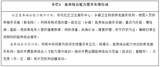 增加醫(yī)養(yǎng)結(jié)合服務(wù)供給。實施社區(qū)醫(yī)養(yǎng)結(jié)合能力提升行動。積極開展基本公共衛(wèi)生服務(wù)老年健康與醫(yī)養(yǎng)結(jié)合服務(wù)項目。支持優(yōu)撫醫(yī)院、光榮院轉(zhuǎn)型,開展醫(yī)養(yǎng)結(jié)合服務(wù)。推動社區(qū)衛(wèi)生服務(wù)中心與社區(qū)養(yǎng)老服務(wù)機構(gòu)、鄉(xiāng)鎮(zhèn)衛(wèi)生院與特困人員供養(yǎng)服務(wù)設(shè)施(敬老院)、村衛(wèi)生室與農(nóng)村幸福院毗鄰建設(shè),采取多種有效方式實現(xiàn)資源整合、服務(wù)銜接。