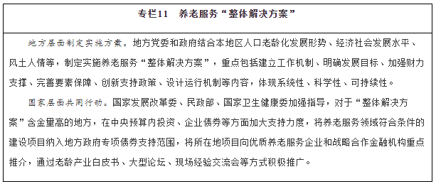 各?。ㄗ灾螀^(qū)、直轄市)要根據(jù)人口老齡化發(fā)展形勢,制定實施專項規(guī)劃,加強與相關(guān)規(guī)劃銜接。各級老齡工作委員會要發(fā)揮統(tǒng)籌協(xié)調(diào)作用,推動老齡工作委員會各成員單位履職盡責,形成工作合力。發(fā)揮養(yǎng)老服務(wù)聯(lián)席會議制度作用,推進養(yǎng)老服務(wù)體系建設(shè),強化區(qū)域養(yǎng)老服務(wù)資源統(tǒng)籌管理。支持城市群、都市圈打造養(yǎng)老服務(wù)體系一體化建設(shè)格局,形成服務(wù)能力銜接、產(chǎn)業(yè)發(fā)展協(xié)同的合作區(qū)域。支持大型城市和區(qū)域中心城市推動養(yǎng)老產(chǎn)業(yè)集聚發(fā)展,充分發(fā)揮輻射帶動和示范作用。推動以地級行政區(qū)為單位制定“整體解決方案”,將老齡事業(yè)發(fā)展和養(yǎng)老服務(wù)體系建設(shè)納入經(jīng)濟社會發(fā)展全局中通盤考慮,全方位整合資源力量,充分調(diào)動各方積極性,推動兜底性、普惠型、多樣化三種路徑協(xié)同發(fā)展。
